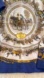 Elegant Hermès silk scarf featuring the La Promenade de Longchamps design. Intricate illustrations with blue, gold, and cream tones.