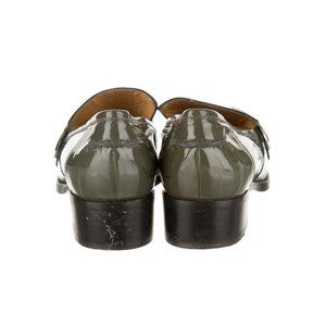 Green patent leather round-toe loafers with silver-tone H buckle.