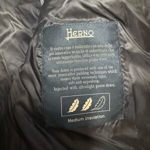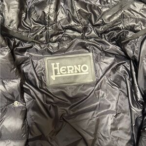 Stylish Herno black puffer jacket with a hood. Perfect for cold weather.