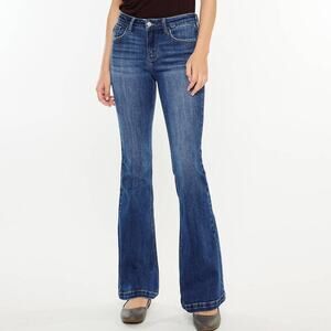 HERS Kan Can mid-rise flare jeans. Made from stretchy denim. Feature a flattering mid-rise and a fun flare. Perfect for any occasion. Medium to dark wash with light whiskering. In excellent condition. Marked size 11, fit like a 28 or 29, see measurements - 14.5" waist; 11" rise; 31.5" inseam.