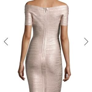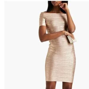 HERVE LEGER Carmen Off Shoulder Dress Rose Gold Metallic Sz XS $1,390 {F26}