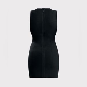 A bodycon knit dress cut in a mini-length silhouette with a crystal-trimmed cutout on the bust.