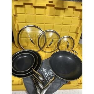 Please refer to pictures for the condition. All items were wiped down and inspected but please double check the photos to know what you will be receiving. First picture not of the actual item for demonstration only* Shows regular use. Bottom and some on top of pans show minor scratches and cooking stains. Each item pictured in the following order front and back: wok, 12", 10" and 8" HexClad's patented hybrid tech utilizes tri-ply construction – aluminum between two layers of stainless-steel – laser-etched with our hexagonal nonstick surface to deliver the searing power of stainless, the durability of cast-iron, and the easy cleanup of nonstick. Use your HexClad cookware on any household stovetop, including induction. Each piece is scratch-resistant, dishwasher-safe, and oven-safe up to 500°F (HexClad lids are oven-safe up to 400°F). All HexClad cookware is a breeze to keep clean. The surface is metal-utensil-resistant and, while hand-washing is highly recommended, it can be cleaned in the dishwasher. Seasoning according to the official instructions is essential to enjoying HexClad's hybrid nonstick functionality. #55