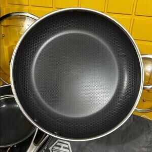 Please refer to pictures for the condition. All items were wiped down and inspected but please double check the photos to know what you will be receiving. First picture not of the actual item for demonstration only* Shows regular use. Bottom and some on top of pans show minor scratches and cooking stains. Each item pictured in the following order front and back: wok, 12", 10" and 8" HexClad's patented hybrid tech utilizes tri-ply construction – aluminum between two layers of stainless-steel – laser-etched with our hexagonal nonstick surface to deliver the searing power of stainless, the durability of cast-iron, and the easy cleanup of nonstick. Use your HexClad cookware on any household stovetop, including induction. Each piece is scratch-resistant, dishwasher-safe, and oven-safe up to 500°F (HexClad lids are oven-safe up to 400°F). All HexClad cookware is a breeze to keep clean. The surface is metal-utensil-resistant and, while hand-washing is highly recommended, it can be cleaned in the dishwasher. Seasoning according to the official instructions is essential to enjoying HexClad's hybrid nonstick functionality. #71