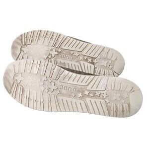 The HEY DUDE Men's Wally Stretch Sox in size 13 are tan-colored slip-on socks made from a lightweight and comfortable cotton blend fabric. They feature a round toe shape and a standard shoe width, making them versatile for travel, casual wear, and workwear. The socks are accented with a logo and are designed with a focus on comfort, being washable and equipped with a foam insole for added cushioning. Perfect for outdoor activities, these stretch sox are a stylish and practical choice for men looking for quality footwear. Some sole wear. Washed and ready to wear!