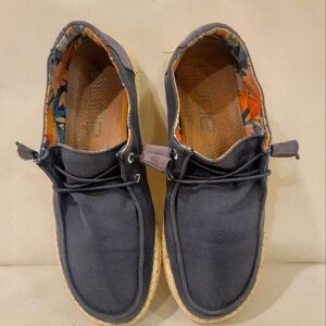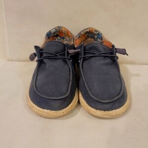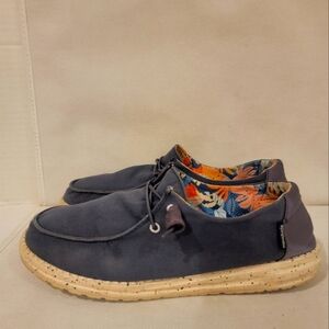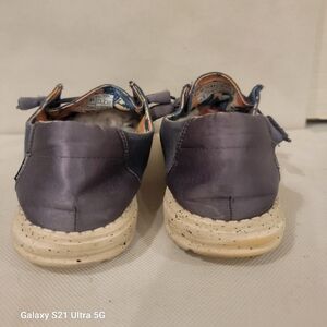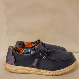 Hey Dude Wendy slip on flats (sz 10). The color of the flats is called denim. The back heels are satin-like. The shoes are in ver good condition. Please see all pictures.