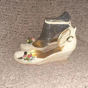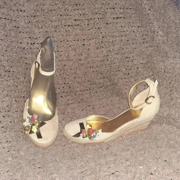 HEYRAUD 1921-Embellished Beige Suede-Flowers/Bells-Wedge-Sz 37-Excellent