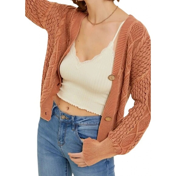 HEYSON Baked Clay Washed Cable Knit Button Down Cardigan Medium Bohemian NEW