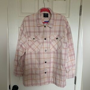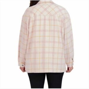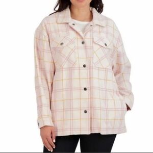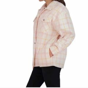Ladies snap button shirt jacket. Relaxed fit, warm shell, front snap closure, chest snap pockets, dropped shoulders with side slit pockets.