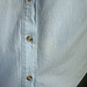 Vintage HGNY Jeans button-front denim shirt in a soft, faded light wash. Features a mandarin collar, long sleeves with button cuffs, and dual chest pockets for a classic utilitarian vibe. Made from 100% cotton, this shirt has that perfectly broken-in feel with subtle fading and faint stains that enhance its vintage character.