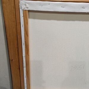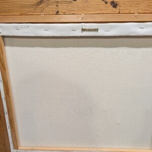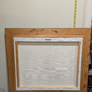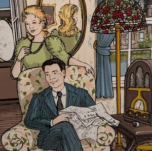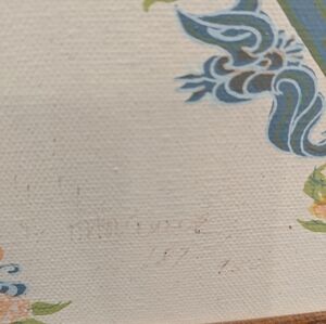 Charming tapestry depicting a family scene in a wooden frame. Features a variety of colors including brown, blue, and cream.