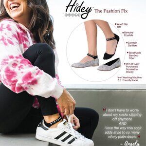 Don't you just hate those little no show socks that never stay up because your shoe "eats" them or they don't stay put? Meet the Hidey Sock! A patented no show sock that won't fall down and looks stylish and cute. The patented "ankle strap" holds them up and the added Swarovski Crystals give them a bling factor that dresses up any pair of shoes. With a gel comfort heel and bamboo fabric, these socks will cover your feet in just the right places and elevate your shoe style!