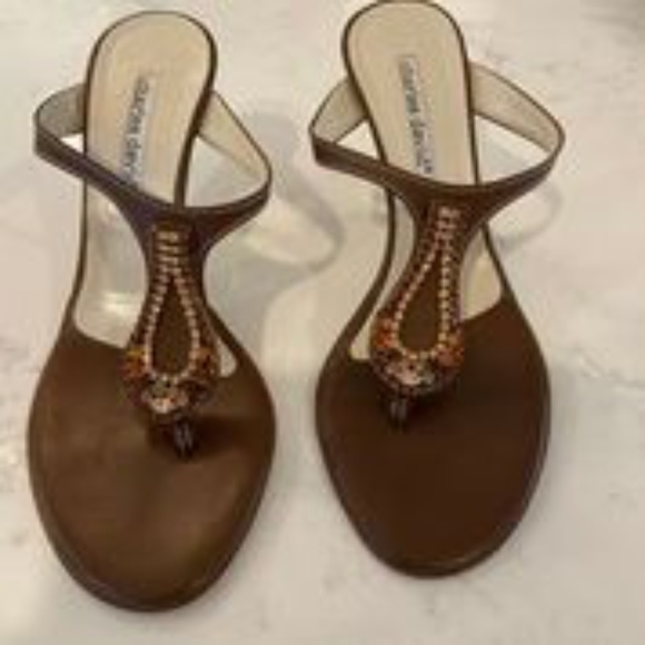 CHARLES DAVID STRAPY OPEN TOE SHOE IN DARK BROWN WITH APPLIED JEWELS. SIZE IS A EUROPEAN 37.5 OR A WOMENS 7 IN US. HEELS IN GREAT CONDITION AND NO JEWELS ARE MISSING.