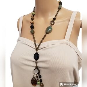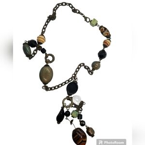 High quality antique brass necklace adorned with murano art glass pendants of various colors and shapes some with marbled patterns. Necklace measures 24 inches in length with a lobster claw closure. Beautiful one of a kind piece.