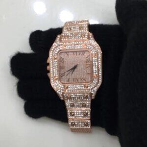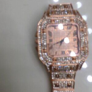 Reselling a stunning, high-quality quartz watch with a stainless steel bracelet fully iced-out in shine. The piece fits a medium wrist size (not sure if it can be tightened). It runs smoothly, ticks perfectly, and you can easily adjust the time. Features a bold square face with Roman numeral time for that luxury feel.