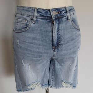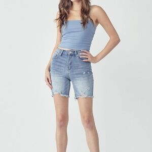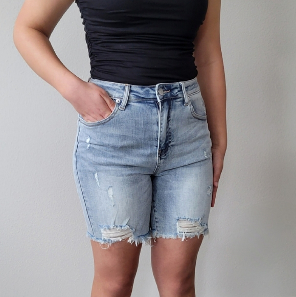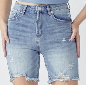 HIGH RISE MID THIGH LIGHT WASH RISEN SHORTS