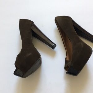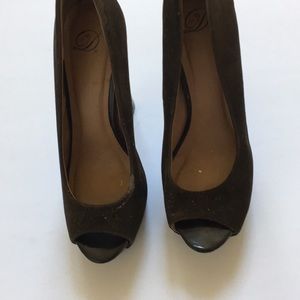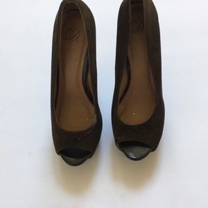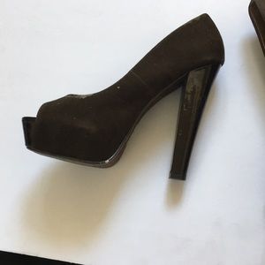 Done in a rich chocolate brown these manmade pumps feel like suede with a patent heel and a peep toe