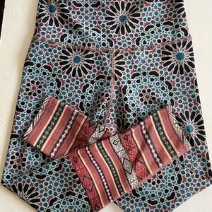 High waisted crop leggings with medallion design and contrasting print legs . No tags , but approximate measurements are waistband 5” wide, waist flat 13.5”, rise 13”, inseam approximately 34”.