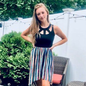 - Black body-con dress under a colorfully striped high-low overlay bottom
