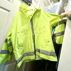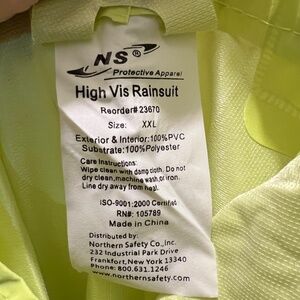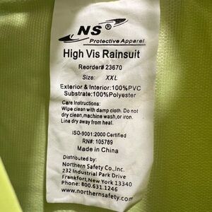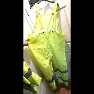 High-visibility rain jacket and bib overalls in a bright yellow-green color, commonly used for safety, clothing. Jacket features a hood and a front closure with snap buttons and has reflective gray stripes around the sleeves and near the hem, enhancing visibility. It includes two front pockets and is designed for safety in low-light conditions. The overalls feature shoulder straps with black buckles and has reflective bands around the lower legs. These overalls are designed for visibility and safety, often worn in construction or roadside work environments. Great condition, I’ve pointed out a few light marks, and the one at the knee from the tape that had pricing on it and leaked through. Definitely unisex, so I will be listing this one suit as men's XXL and women's 3XL. Exterior & Interior: 100% PVC Substrate: 100% Polyester Reorder# 23670.