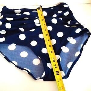 HIGH-WAIST RUCHED BIKINI BOTTOMS Navy Blue White Polkadot Size Small NWOT