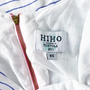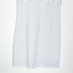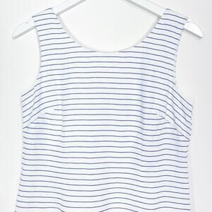 Sleeveless dress in white with blue stripes. Coral pink exposed back zipper. Designer in Tortola BVI.