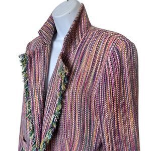 Elevate your wardrobe with this chic multicolored striped blazer from Hilary Radley for Katherine Barclay. Crafted from a blend of 60% rayon and 40% cotton, this blazer features a vibrant weave with playful fringe detailing along the lapels and hem. The interior is lined with a soft pink fabric, adding a touch of femininity. Ideal for adding a pop of color to any ensemble, this blazer is both bold and stylish. Available in size 8, it promises a flattering fit that pairs well with both casual and formal attire.