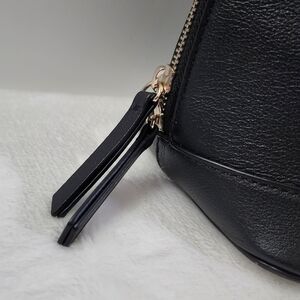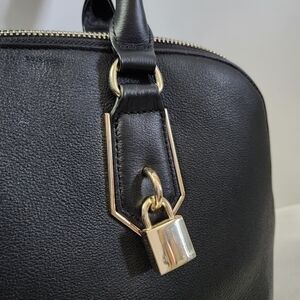 Hilary Radley Faye Black Cowhide Leather Handbag Shoulder Bag Purse. Classic & sophisticated style! Gold tone hardware & accents with a padlock, metal protective feet, 2 zipper pullers for easy accessibility, 1 interior zip pocket, 2 interior dual slip compartments, black polyester textile lining for easy cleaning, 6.5" strap drop, bag size is 12.5" x 5.75 x 9.25". NO satchel strap included. Leather conditioned with Dr. Martens Wonder Balsam. No rips or stains. Like new condition!