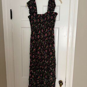 The Ellie is an A-line Nap Dress® with elasticated smocking, ruffled shoulders, and a tiered midi skirt.