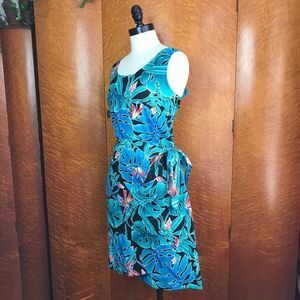 Gorgeous, super crisp, barely worn, TROPICAL Birds of Paradise COTTON sundress with tie waist, sleeveless cut and vivid colors. The Hawaiian Original. Black & Turquoise beauty. THE PERFECT pinup dress. Ultra tiki, VLV ready and perfect for cocktails by the pool or tiki bar.
