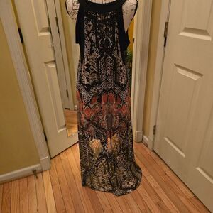 This dress features a scoop neck, sleeveless and a split down the center. A black sheath skirt peeks out as you walk. The flowy material lends a touch of whimsy and carefree attitude. Size M.