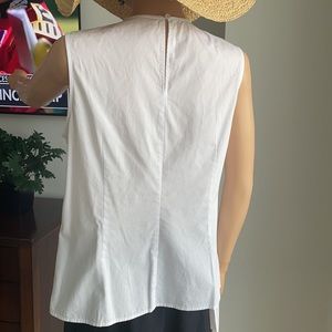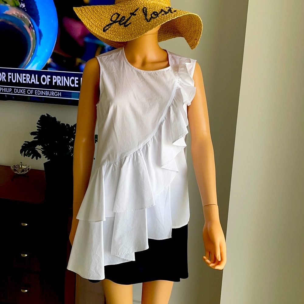 Interesting white sleeveless top. One side longer, the other shorter with hidden zipper. No labels inside but it’s a Garcia top size medium. Would fit a 6-8. Never worn