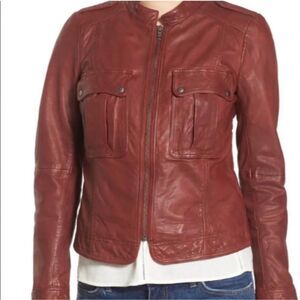 Genuine leather jacket in a rusty-brown color. Slightly distressed/broken-in look. Soft feel. Snap pockets at the chest. Snap cuffs. Zip front.