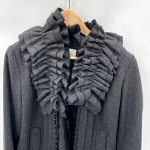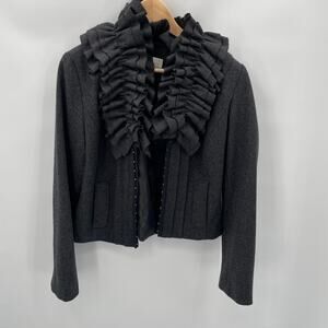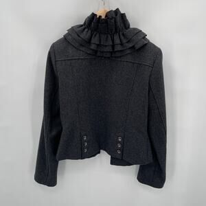 Hinge designed in Seattle. Sold at Nordstrom. Gray wool jacket with ruffle collar. Hook closure. Back buttoned openings. Front pockets. Wool viscose polyester blend with black polyester lining.