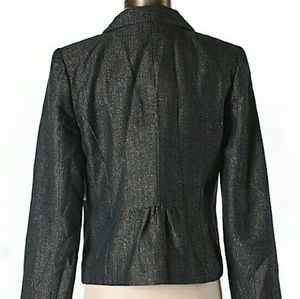 Absolutely adorable! This blazer is NEW and has all tags(including spare button). Shimmer metallic, combined with the ruffle back and hugged waist makes this for a very feminine style. Looks great with skirt or jeans. Thank you