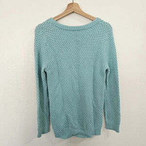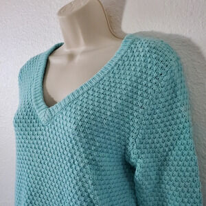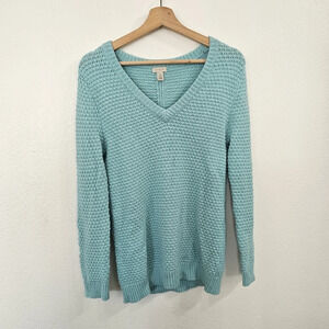 Blue v-neck open-knit sweater with ribbed hem and sleeves. Size M. EUC.