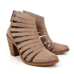 HINGE BEIGE GENUINE LEATHER STRAPPY MED HIGH HEEL BOOTIES BOOTS SHOES 7.5M