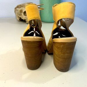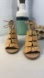 This is a pair of Hinge “Drea” laced heeled sandals in taupe, featuring open toe design and fully adjustable straps.