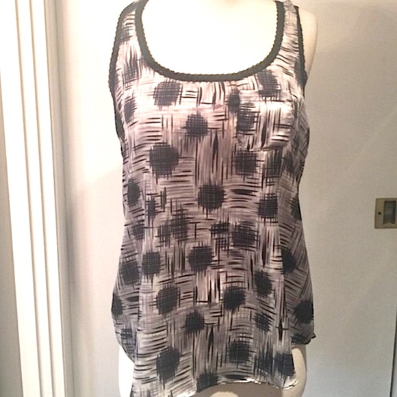 Scoop neck tank top with a grey and black abstract geometric pattern, with scalloped trim around the neckline and armholes.