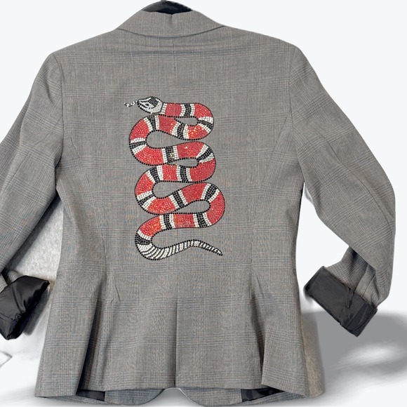 Keywords: Plaid Blazer, Embellished Jacket, Rhinestone Snake, Designer Blazer, Statement Jacket, Edgy Fashion, Unique Apparel, Night Out, Special Occasion, Fashion Forward, Glamorous, Chic, Women's Blazer, Made in USA