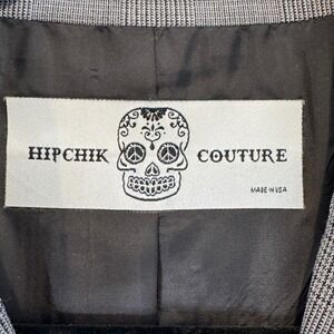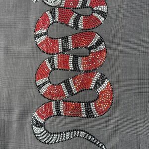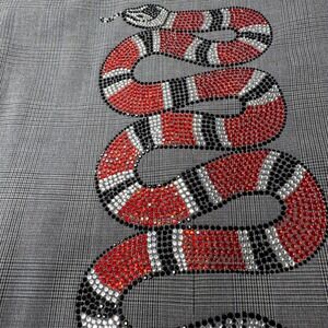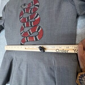 Make a bold statement with this striking HIPCHIK COUTURE blazer. The classic grey plaid is elevated by an eye-catching snake embellished with shimmering rhinestones across the back, adding a touch of edgy glamour. This jacket is designed to turn heads and command attention, perfect for adding a unique flair to your wardrobe. Imagine wearing this to a night out with friends or a fashion-forward event.