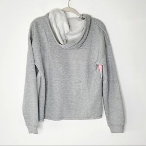 Hippie Rose grey sweater with hoodie and draw string. Pink and white color block front design. raw hem. Warm and NWT. Size M