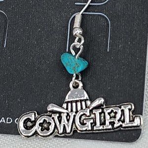 Silver tone metal dangling "cowgirl" shaped metal design with a little cowboy hat and faux turquoise stones