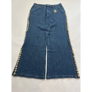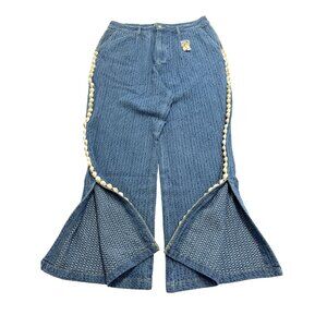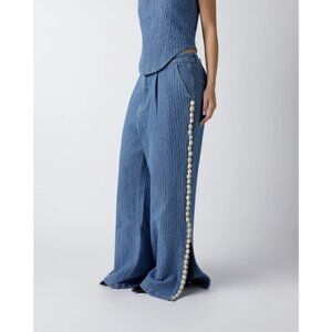 Description from retailer: The Textured Indigo Cowrie Trim Wide-Leg Pants blends a modern fusion of woven fabric and denim structure for a bold, tactile finish. Redefining everyday luxury with hand-stitched cowrie shell embellishments and a subtle split hem that adds effortless movement.