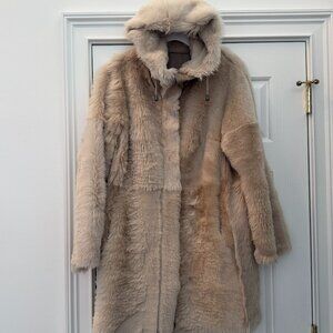 New reversible nappa parka. Relaxed fit. drawstring hood. Drop shoulder. gusseted armhole. Zipper closure and pockets. Purchased at Bloomingdales, worn once. Beautiful blond shearling color.