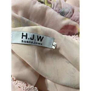 Tag says Large but runs small, see measurements given in listing. H.J.W. size L/M Pink floral Spring Summer dress Cottage Core romantic feminine, lace straps, side zipper, lined. 100% polyester