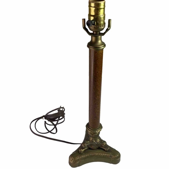 Add a touch of classic elegance to your living space with this stunning table lamp. Crafted with a faux brass and wood finish, this lamp boasts a triangular base design that exudes sophistication. The antique look of this lamp comes from its original vintage design, making it a unique addition to your collection.