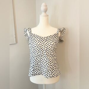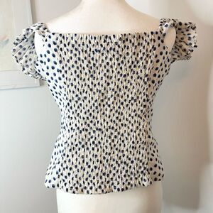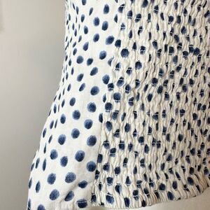 H&M 100% linen perfect summer top. Cream and modern blue dot print.Size medium. Sleeveless with Ruffle detail. Gathering in back for perfect fit.