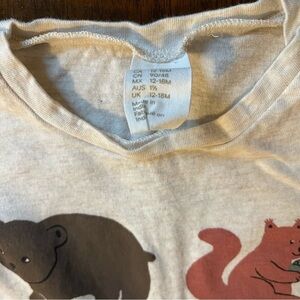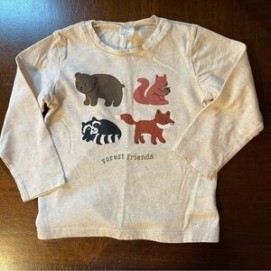 2 long sleeve shirts - one navy and white strip, the other has forest animals