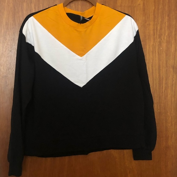 Multi colored sweatshirt. Thin, for warmth layering is best or great for transitioning into spring or fall